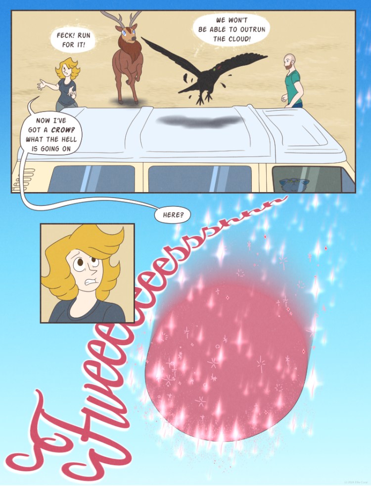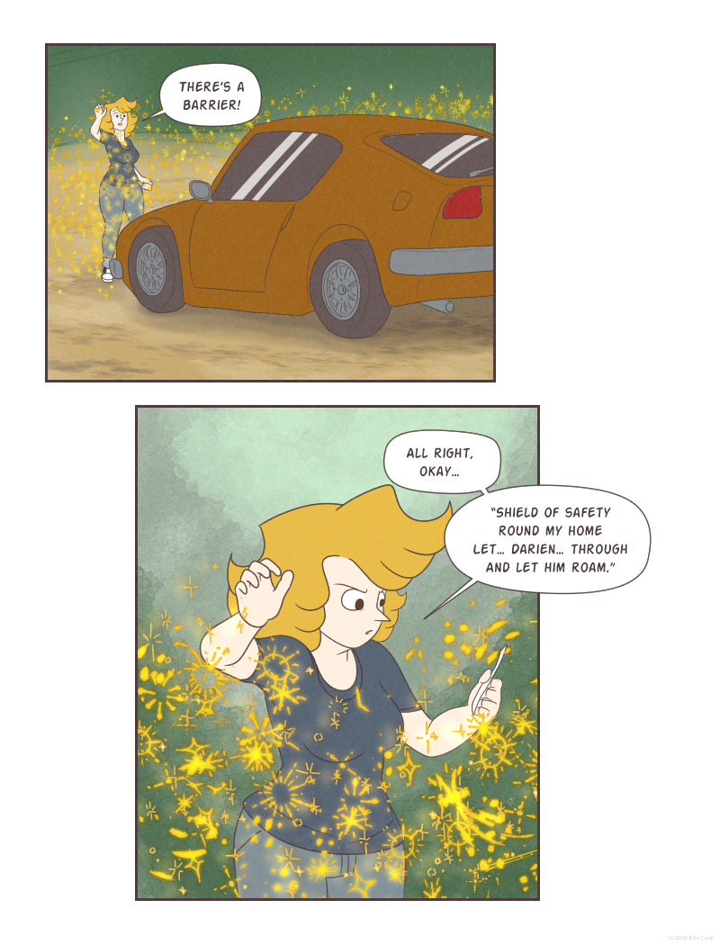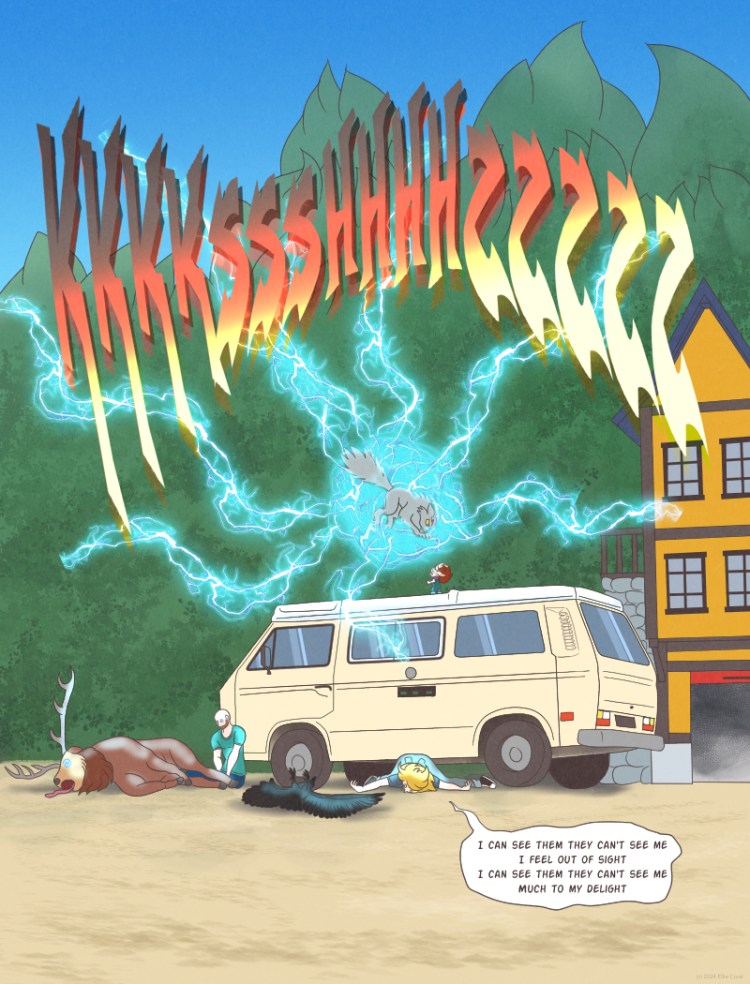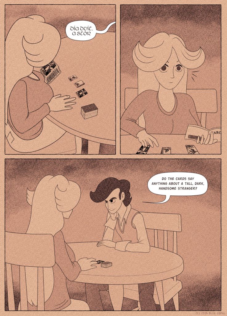 As much as I like the filter/action I’m using in Clip Studio Paint to give these comics an old, worn look, I don’t really like how the effects differ from page to page. I’m selecting the same action, but the gradients, noise, and dithering seem to vary in intensity depending on… I don’t know, how distressed the art goblins in CSP are feeling at the moment, I guess. I did say I was going to experiment with styles and colors, but I was hoping for some consistency.