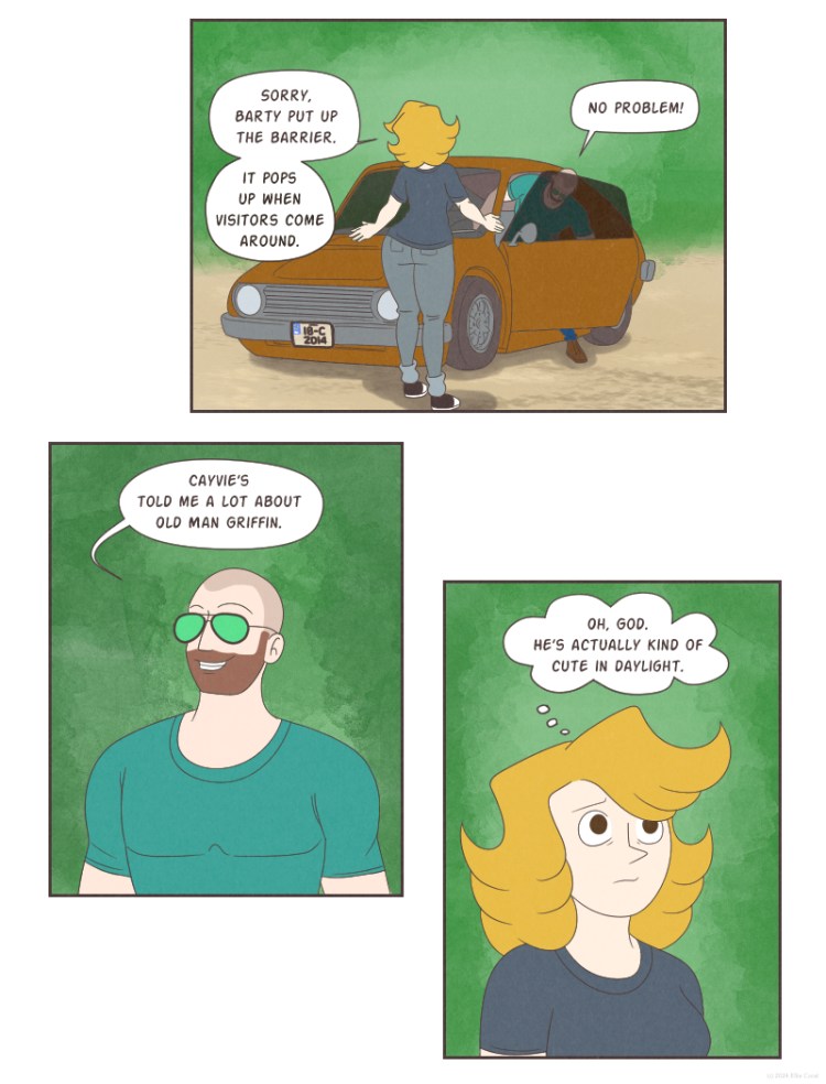 Daytime. A tranquil, open area with a long garage building. The sign on the front reads “Colin Felton’s Conveyance Convenience” with a phone number. A tree stands beside the garage, its large canopy shading the sky, with a lone crow sitting atop the building, observing the scene. Strolling across the dirt is a figure in white silhouette approaches an open garage.