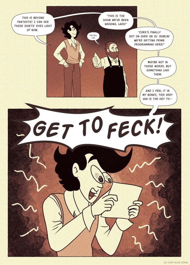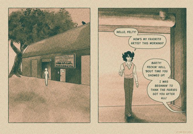 Felty: (off-panel) Barty! Feckin’ hell, ’bout time you showed up! I was beginnin’ to think the fairies got you after all!