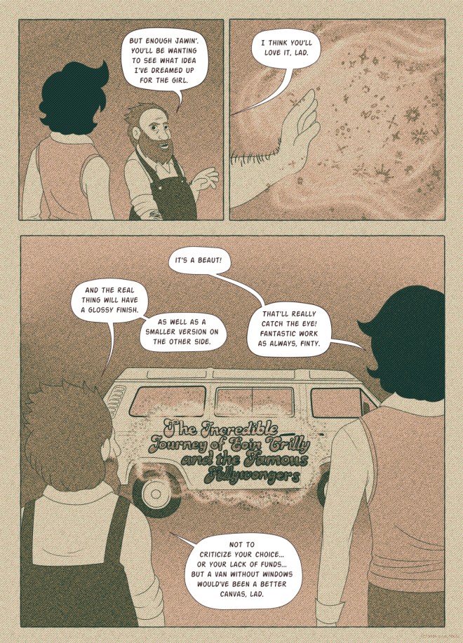 The duo admire the magical preview of Finty’s work. The passenger side of the Westfalia has a poofy, curly, 70s-style font with the logo: The Incredible Journey of Eoin Crilly and the Famous Fellywongers.