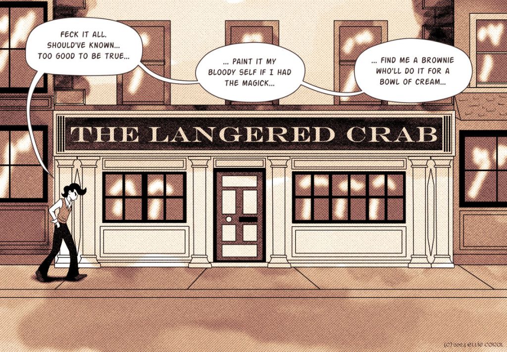 Barty trudges down the sidewalk (or whatever it’s called in Ireland), glaring at the ground. He approaches The Langered Crab, which is decidedly less flowery and festive than its modern depiction.